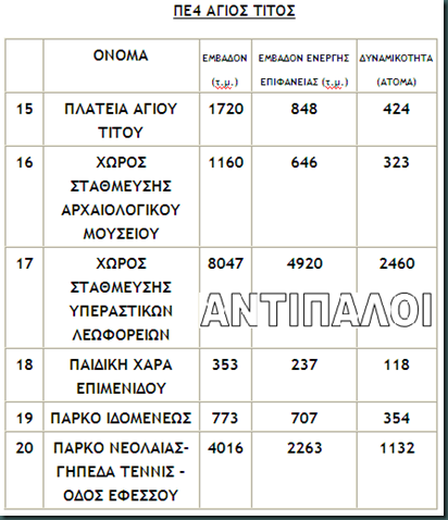 Ακολουθούν πίνακες με τους χώρους καταφυγής ανά περιοχή, καθώς και η έκταση αλλά και η δυναμικότητα του κάθε χώρου σε άτομα:
